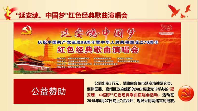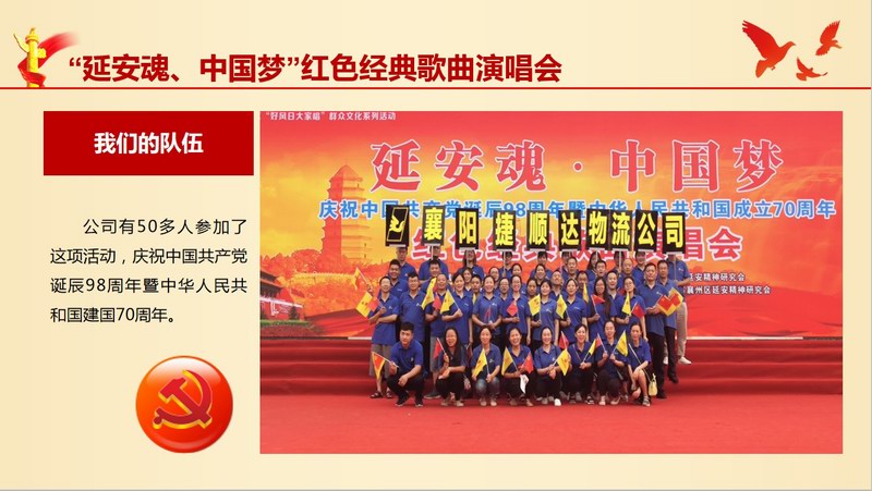 1、迎“七一”我支部贊助“延安精神研究會”經費,并組建方陣觀看“延安魂、中國夢”紅色經典歌曲演唱會,讓員工重溫昔日先烈風彩,激昂工作熱情。