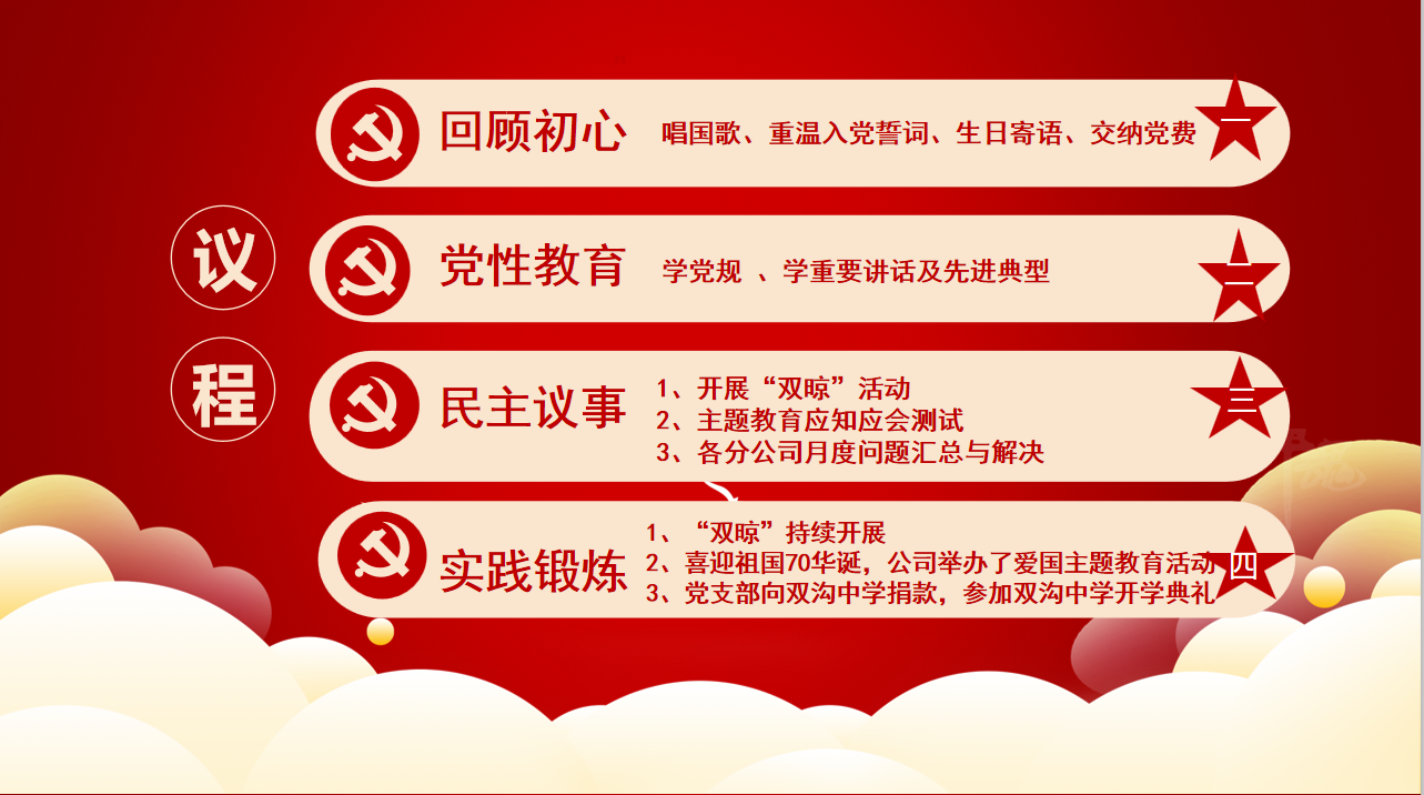 2019年10月25日下午14:30捷順達黨支部召開了本月黨建會:開展第二批“不忘初心,牢記使命”主題教育;本次會議共有4大項;1、回顧初心 2、黨性教育 3、民主議事 4、實踐鍛煉