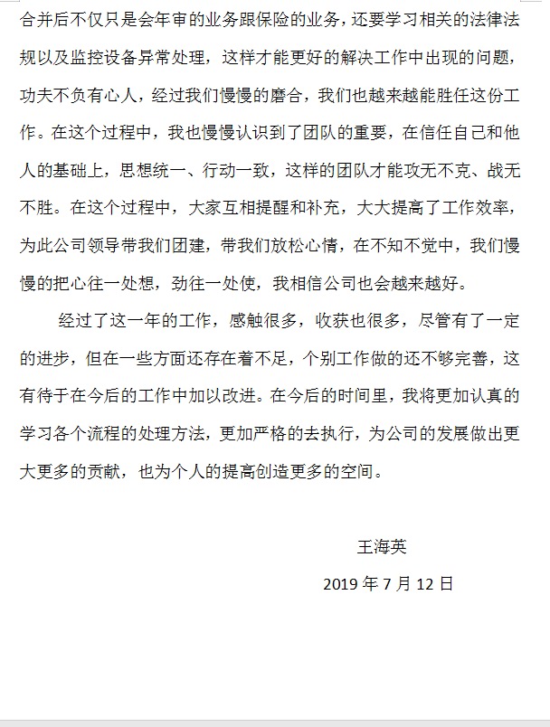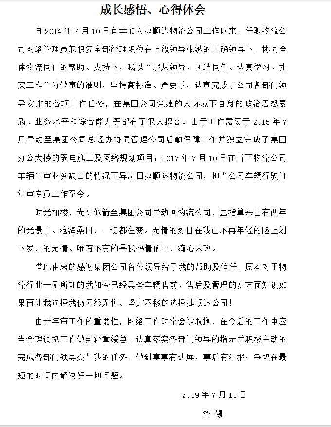 在7月份落實(shí)公司下發(fā)的《關(guān)于增強(qiáng)“傳幫帶”企業(yè)文化的通知》中,有王海英、答凱、馮千紅、朱德麗、何開云5名工齡增長(zhǎng)的員工參與到這項(xiàng)工作中來,其中王海英、朱德麗、馮千紅3位員工在晨會(huì)上與大家共同分享了自己的成長(zhǎng)歷程、工作經(jīng)驗(yàn).經(jīng)過評(píng)審,王海英和答凱的工齡感悟攜帶非常認(rèn)真且用心,值得我們大家學(xué)習(xí),總經(jīng)辦已將文章上傳至公司微網(wǎng)站,大家可查閱學(xué)習(xí),根據(jù)文件規(guī)定對(duì)王海英、答凱各獎(jiǎng)勵(lì)50元,獎(jiǎng)金在2019年7月份工資中發(fā)放。