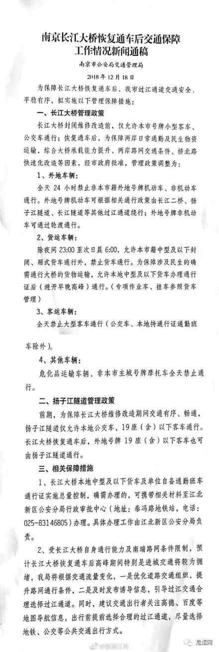 南京市公安交管局剛剛發(fā)布消息,12月29日南京長(zhǎng)江大橋恢復(fù)通車(chē)24小時(shí)禁止非本市籍外地號(hào)牌機(jī)動(dòng)車(chē)、非機(jī)動(dòng)車(chē)通行,禁止大型客車(chē)通行,禁止?;愤\(yùn)輸車(chē)輛、非本市主城號(hào)牌摩托車(chē)通行。