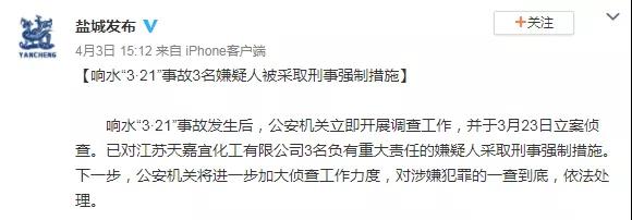 公安機(jī)關(guān)對(duì)江蘇響水天嘉宜化工有限公司3名負(fù)有重大責(zé)任的嫌疑人采取刑事強(qiáng)制措施。