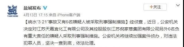 公安機(jī)關(guān)對(duì)江蘇響水天嘉宜化工有限公司及其控股股東江蘇倪家巷集團(tuán)有限公司另外6名負(fù)有重大責(zé)任的嫌疑人采取刑事強(qiáng)制措施。