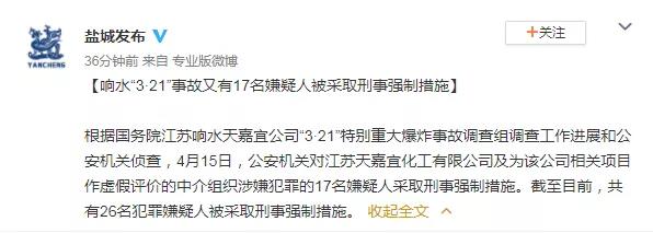 公安機(jī)關(guān)對(duì)江蘇響水天嘉宜化工有限公司及為該公司相關(guān)項(xiàng)目作虛假評(píng)價(jià)的中介組織涉嫌犯罪的17名嫌疑人采取刑事強(qiáng)制措施。