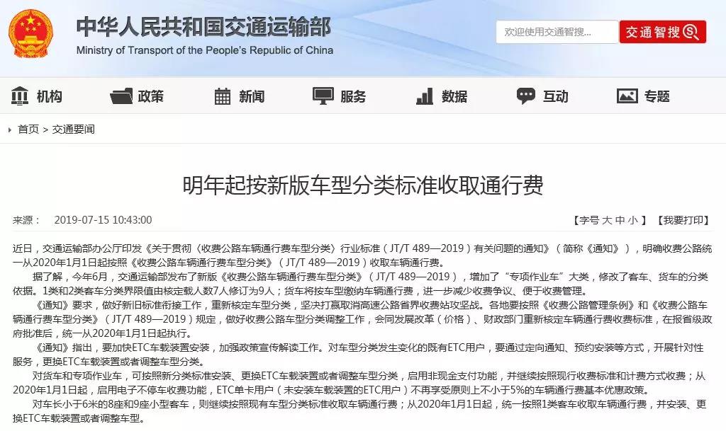 明確收費公路統(tǒng)一從2020年1月1日起按照《收費公路車輛通行費車型分類》(JT/T 489—2019)收取車輛通行費。